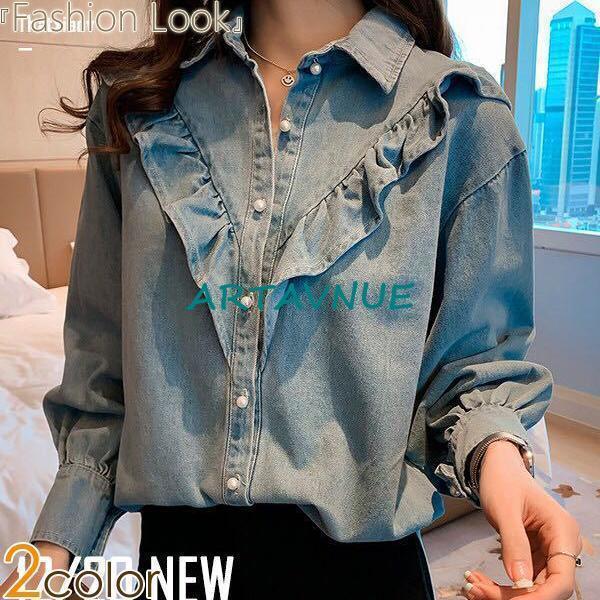 デニムシャツ フリル デニム ブラウス トップス 襟付き シャツブラウス レディース