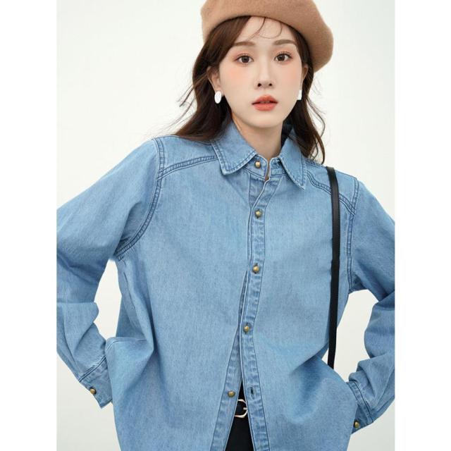 デニムシャツ シャツ ブラウス レディース 長袖 綿 コットン 無地 デニム ヒッコリーシャツ 薄手 ポケット フェミニン 体型カバー 秋