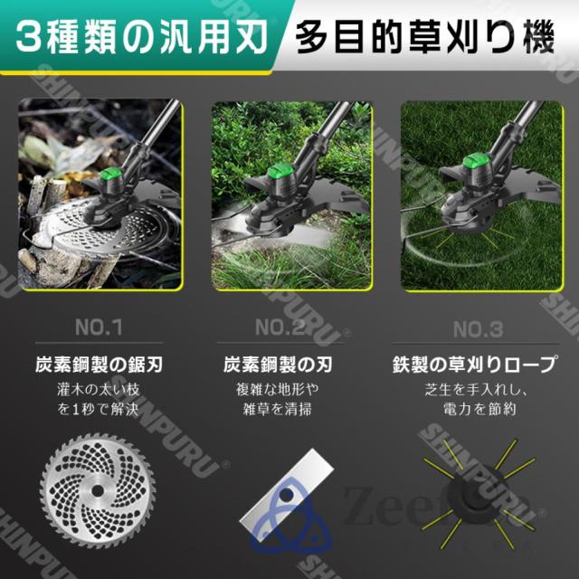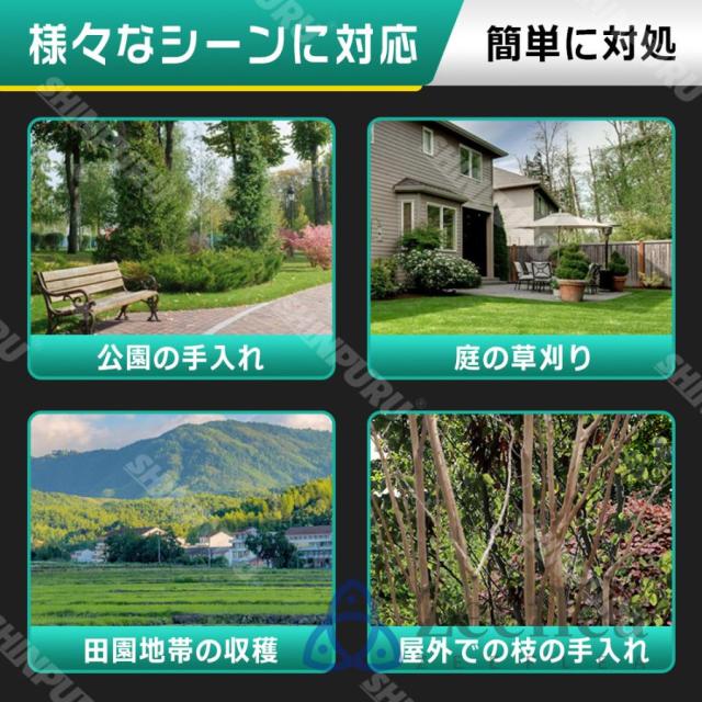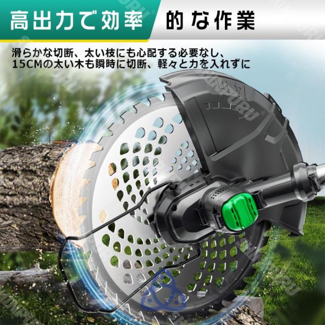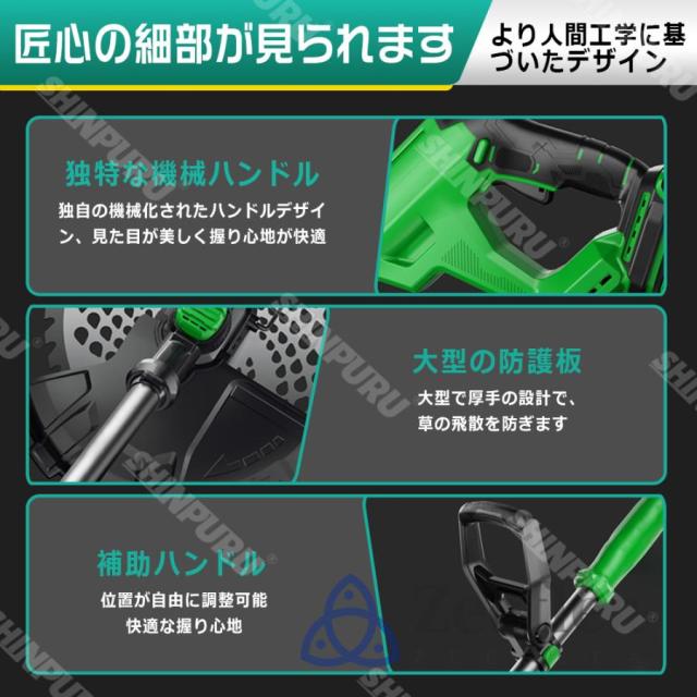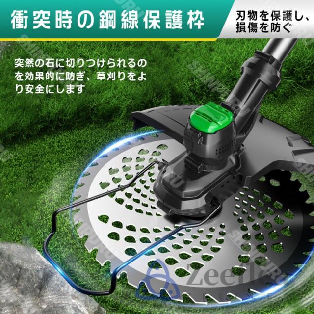 園芸?DIY用途で人気の電動式草刈機。体重量わずか1.8kg、軽量で使いやすく、力の弱い女性やお年寄りでも簡単に扱えます。コードレスなので使いは便利です。大容量バッテリー、近くに電源がなくても使用できます。高品質純銅モーターを採用し、出力は毎分21000rpmの大出力により、草刈り効率は一層向上することができます。庭に生えた雑草の手入れなどの日常用途に最適。使用面を考えて、ロックと保護カバーを搭載。有効に誤操作防止、作業時の草や小石飛散防止になります。取り付け簡単!刃の交換はたった5分で完了します!どんな年齢層の方でも簡単に取り付けできる設計となっています。