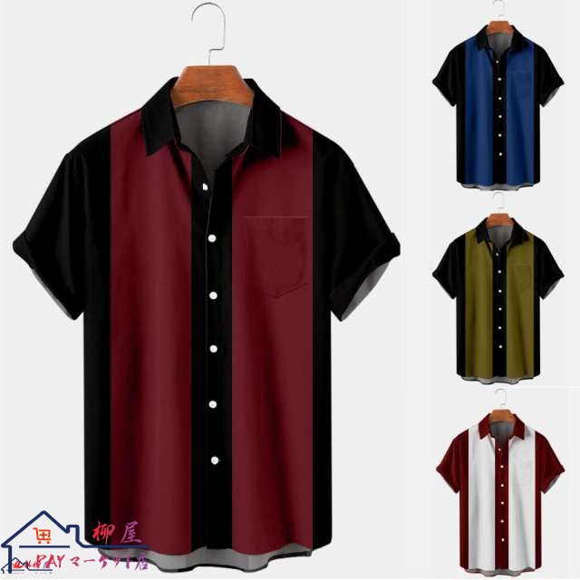 綿シャツ メンズ 半袖 バイカラー オシャレ ボーリング カジュアルシャツ パンク レトロ ロック アメリカロカビリー