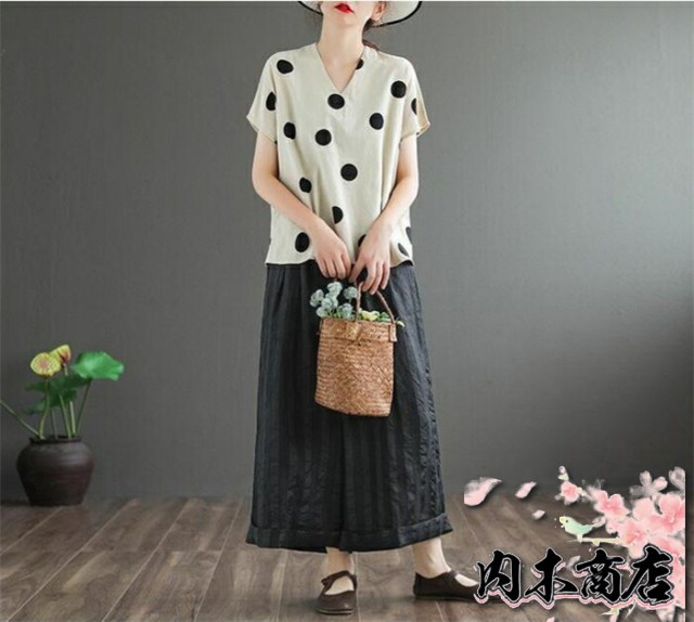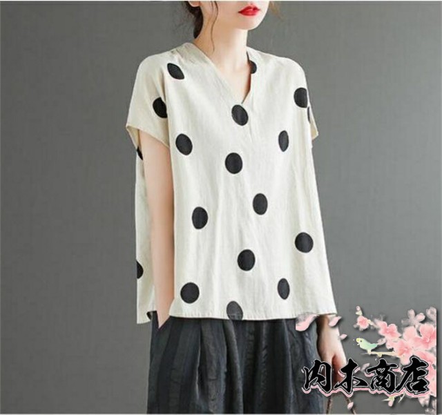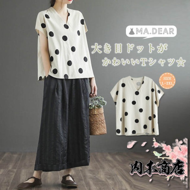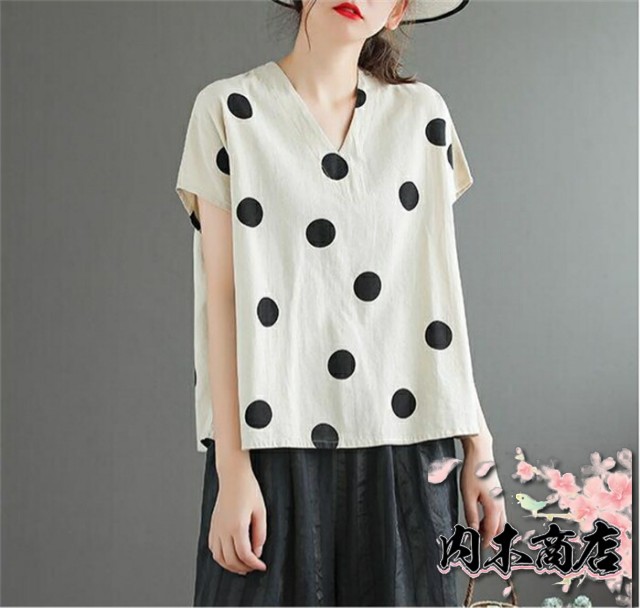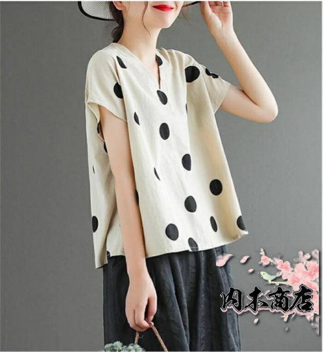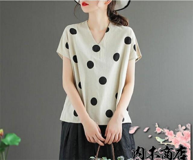 キーワードドット柄 tシャツ 半袖 tシャツ レディース 半袖 ノースリーブ カジュアル tシャツ レディース おしゃれ カットソー レディース vネック 大きめドット 水玉 可愛い 春 夏 ゆったり トップス プルオーバー 着やすい ナチュラル 重ね着 綿麻風 森ガール 30代 40代 50代