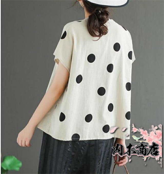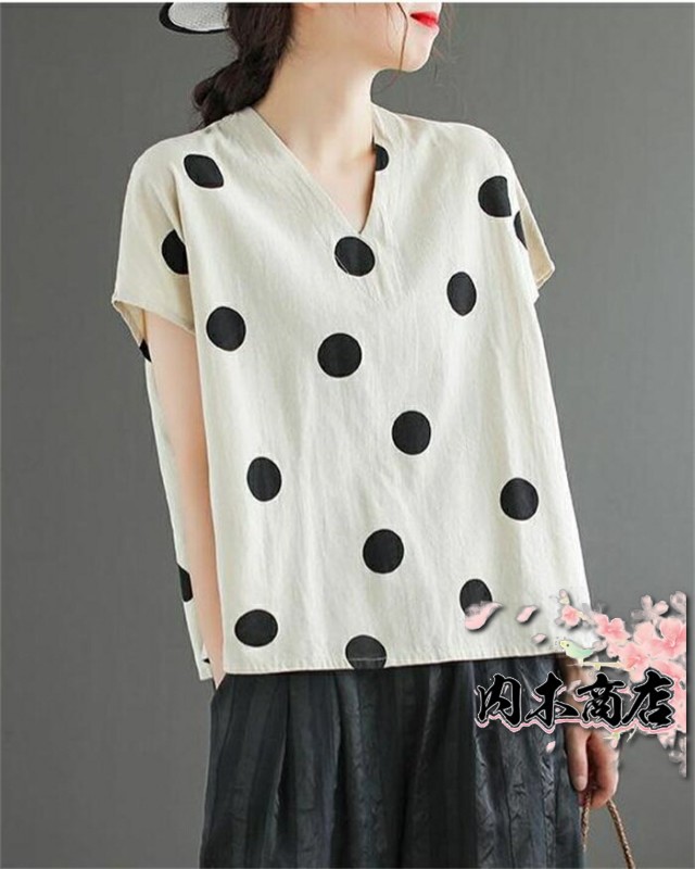 ドット柄 tシャツ 半袖 tシャツ レディース 半袖 ノースリーブ カジュアル tシャツ レディース おしゃれ カットソー レディース vネック 大きめドット 水玉 可愛い 春 夏 ゆったり トップス プルオーバー 着やすい ナチュラル 重ね着 綿麻風 30代 40代 50代