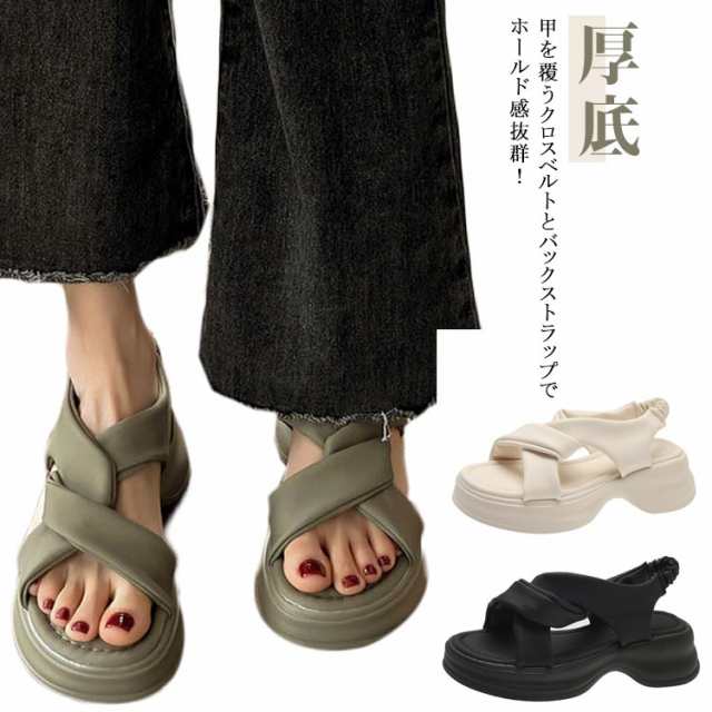 厚底サンダル レディース クロスベルト シューズ・靴 サンダル ブラック ホワイト カーキグリーン サンダル 柔らか 脱げない スクエアトゥ ゴムストラップ クロスベルトサンダル 厚底