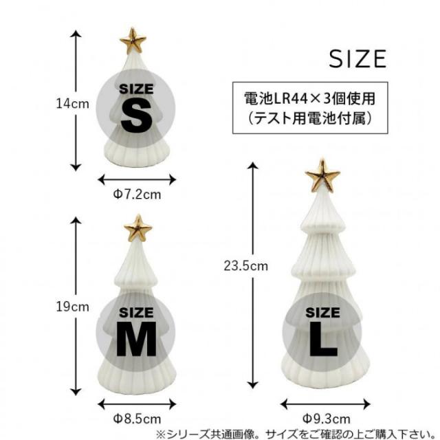 商品詳細:セラミック(陶器)製でLEDライト付きのクリスマスツリーの置物です。ホワイトカラーのツリーにゴールドのスター、ナチュラルな色合いでどんなインテリアにも馴染みます。ミニサイズなので卓上ツリーとしてもおすすめです。陶器製ならではのあたたかみのある素材感をお楽しみください。スイッチを入れるとライトが点灯します。 生産国:中国 素材・材質:セラミック 商品サイズ:Mサイズ:約Φ8.5×19cm 仕様:電池LR44×3個使用(テスト用電池付属) 付属品:テスト電池LR44×3個