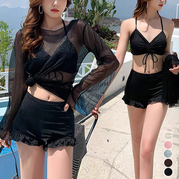 ホルターネックブラトップ ハイウエストショーパン 3点水着セット日焼け防止 体型カバー水着 バックシャンセパレートビキニ海水浴スイムウェア 露出控えめママ水着 水着上下セットラメシースルーラッシュガード、ホルターネックブラトップとハイウエストショーパンお得な3点水着セット