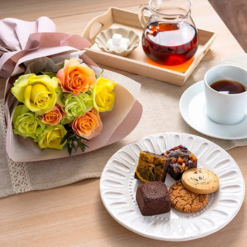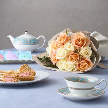 コントラストが美しいホワイトとオレンジのバラブーケに、国産小麦100%のパイ生地に、バニラとフランボワーズの2種のクリームをサンドしたミルフィーユと、ウェッジウッドの紅茶4種をセットにしました。