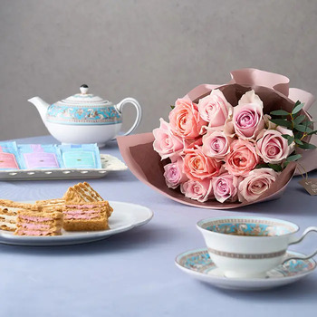 可愛らしいピンクのバラブーケに、国産小麦100%のパイ生地に、バニラとフランボワーズの2種のクリームをサンドしたミルフィーユと、ウェッジウッドの紅茶4種をセットにしました。