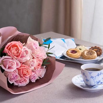 可憐なピンクのバラブーケに、こだわりのコーヒーにクッキーを添えたセットです。