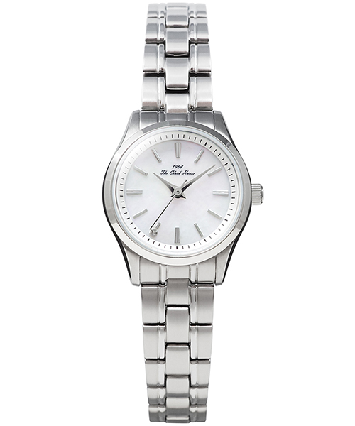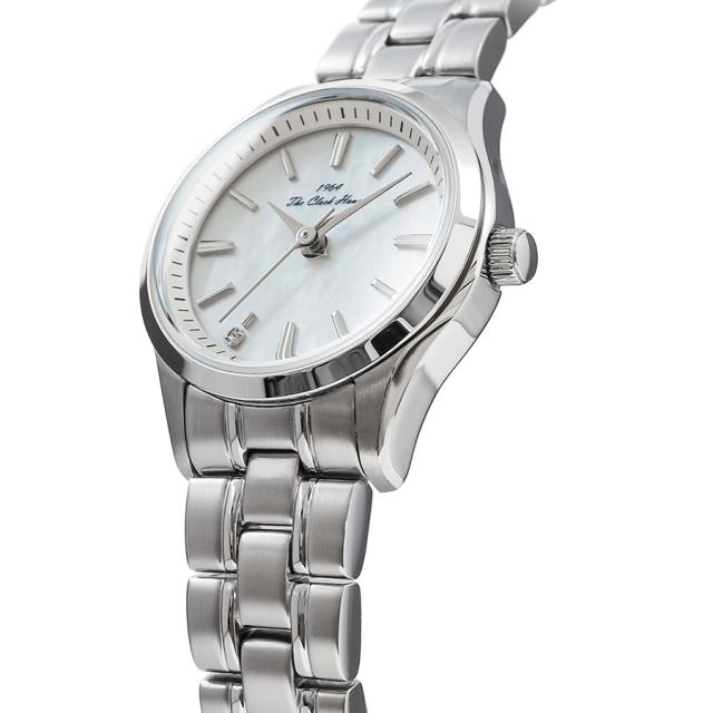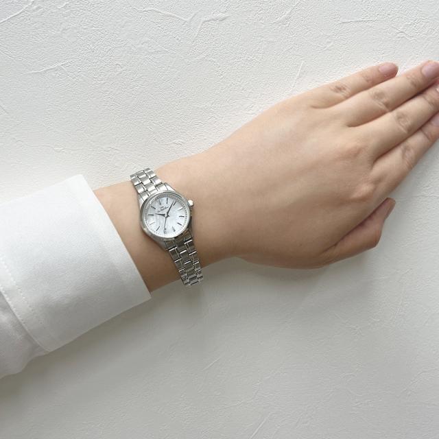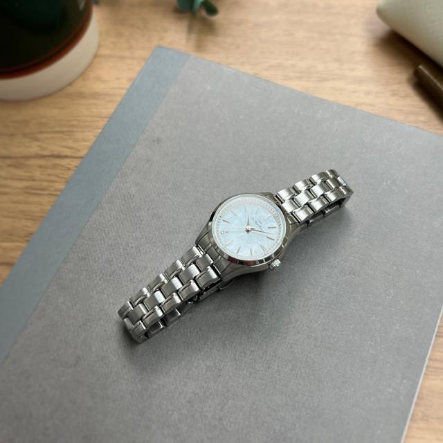 24mmのコンパクトなラウンドケースは、腕元に自然に馴染む上品なサイズ感。文字盤にはマザー・オブ・パールを採用し、光の角度によって繊細に表情を変える輝きが魅力です。