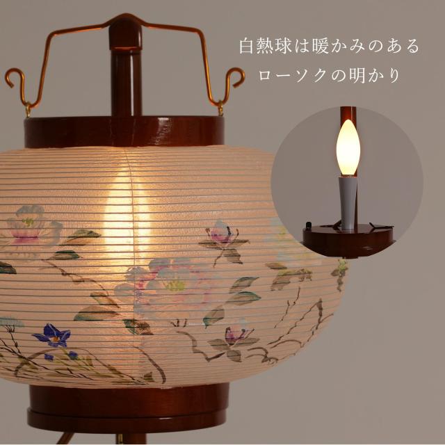 白地の絹張火袋には、淡くやわらかな花模様が丁寧に描かれ、点灯すると、あたたかな光が全体をやさしく包み込み、静かで幻想的な空間が広がります。 本体の木製部分には、深みのあるケヤキ色の塗装を施し、格調高く重厚感のある仕上がりに。