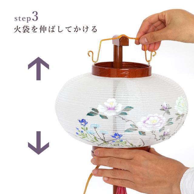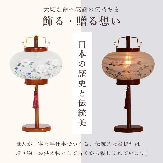 電源は便利なコード式電装タイプ。付属の電球は2種類あり、ひとつは白熱球で、ろうそくのような温もりある伝統的な灯りを。 もうひとつはLED球で、時間の経過とともに移り変わる幻想的な光をお楽しみいただけます。 組み立ても簡単。初めて盆提灯を選ばれる方や、お忙しい中でも手軽に飾りたい方にもおすすめです。