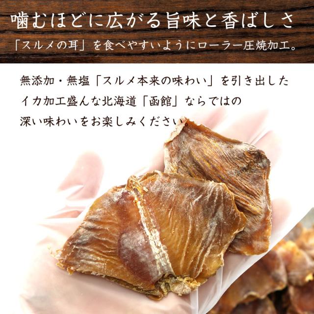 噛むほど旨い「スルメの耳」だけを使用し、食べやすいようにローラー圧焼加工でおいしく仕上げました。