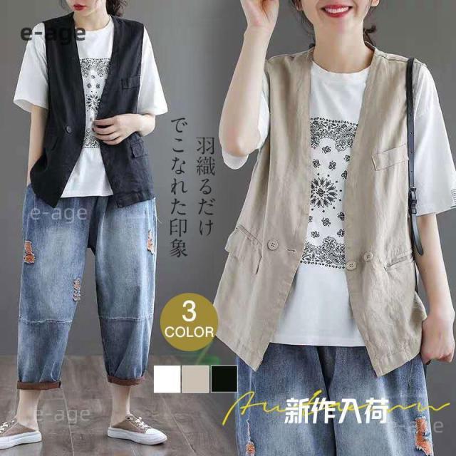 ベスト レディース 薄手 ジレ 夏 前開き チョッキ ジレベスト 綿麻 女性 前開きベスト 春秋