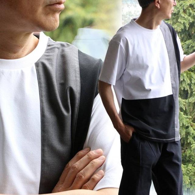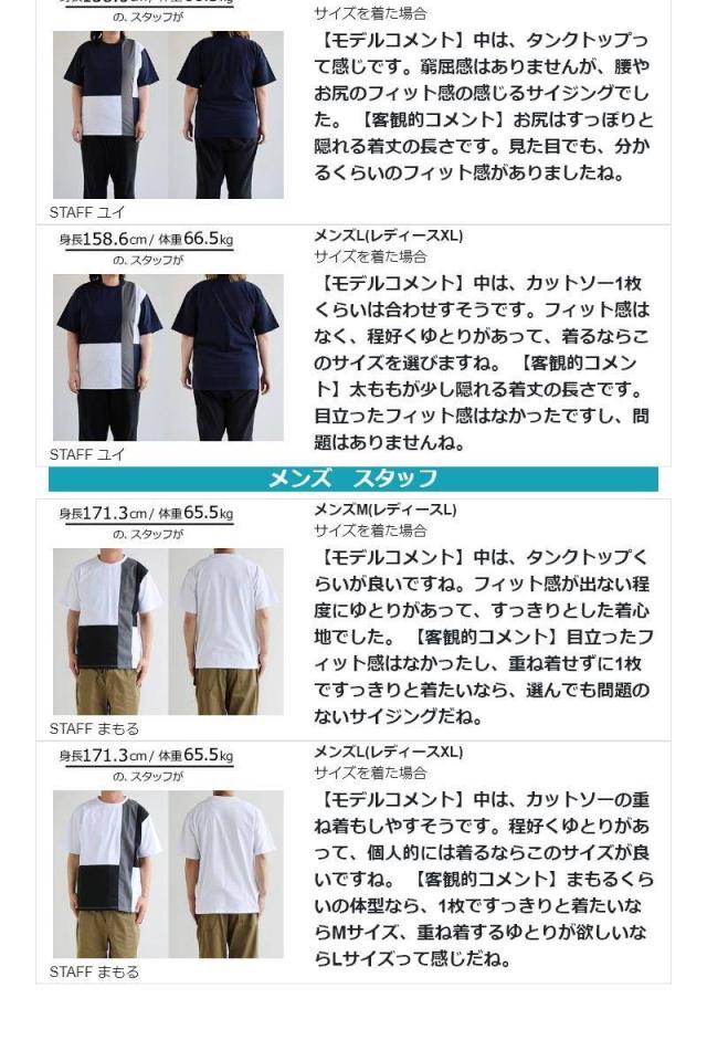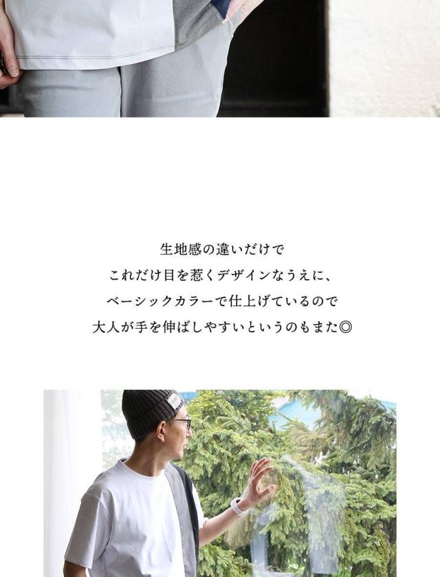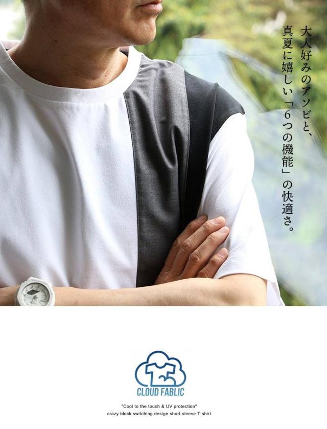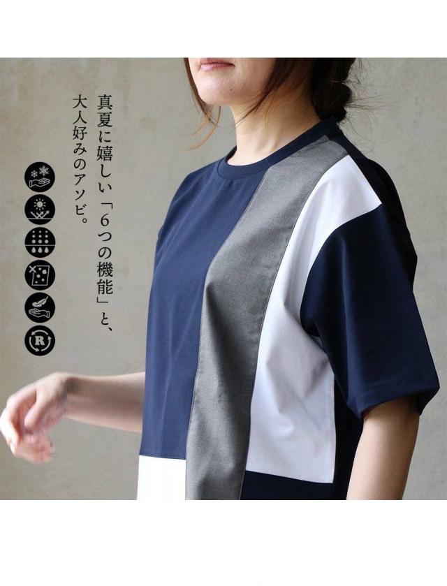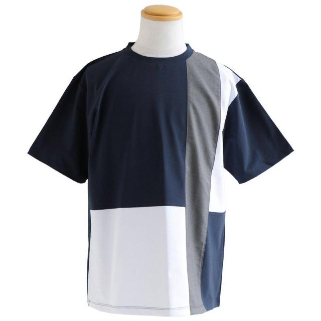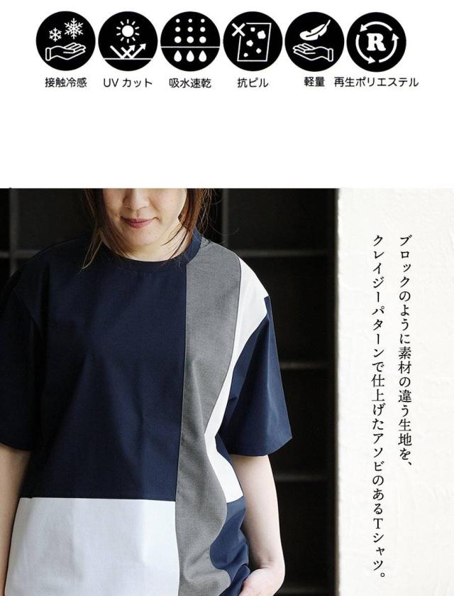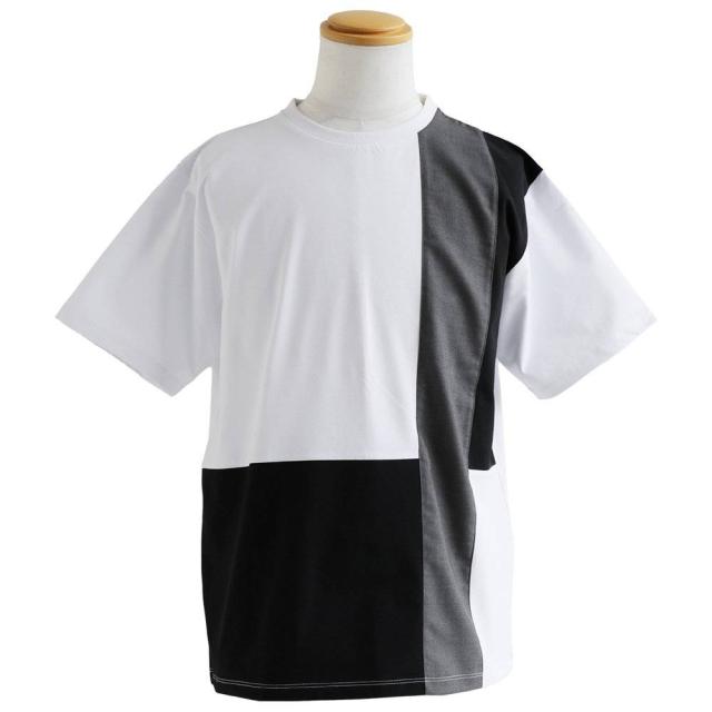 ・ブロックのように素材の違う生地を、クレイジーパターンで仕上げたアソビのあるTシャツ。