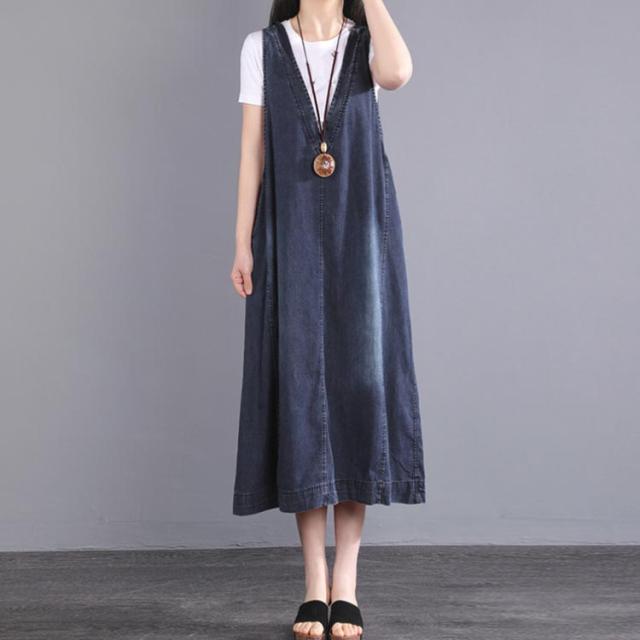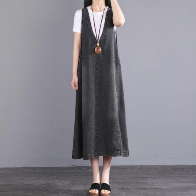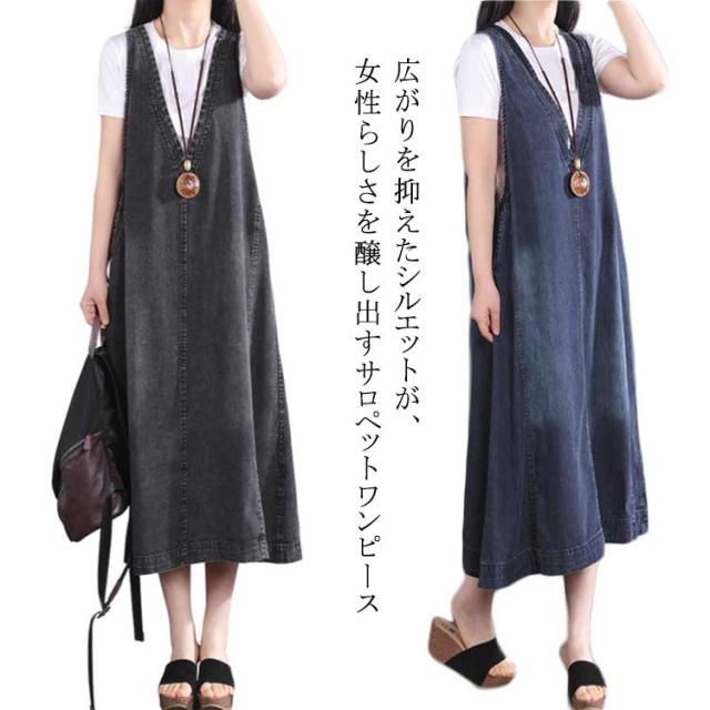 Vネック ロング丈 デニムワンピース デニムベスト マキシ丈 ジャンパースカート スカート オールインワン 春夏 サロペット 重ね着 ノースリーブ ワンピース 大人 おしゃれ 春 ジャンパースカ 女性