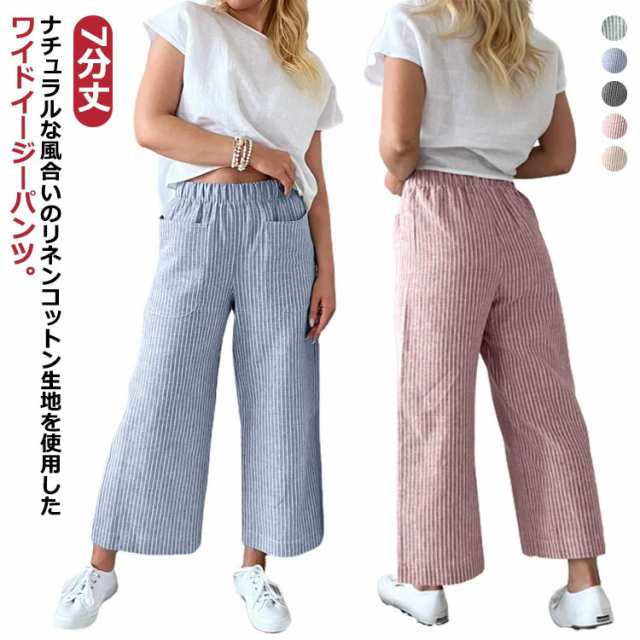 50代 リネン パンツ ボトムス ストライプ柄 7分丈 ワイド リネンパンツ パンツ 綿麻 クロップドパンツ 春 夏 秋 麻パンツ 涼しい 40代 ストレートパンツ 30代 母 ママ 敬老の日 プレゼント 大きいサイズ レディース