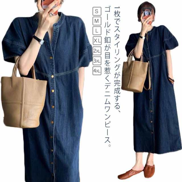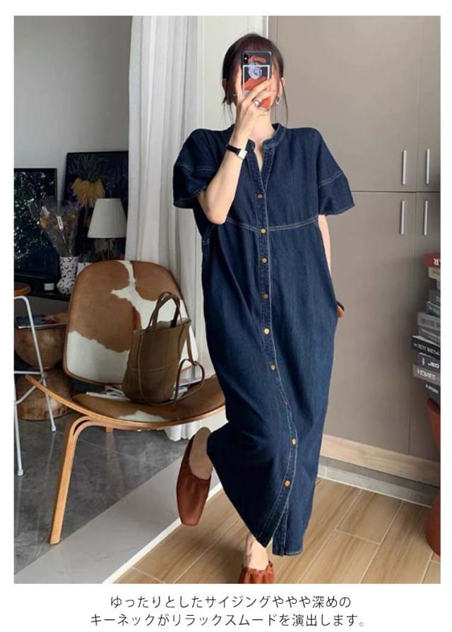 半袖 デニムロングワンピース 夏 デニムワンピース バンドカラー 無地 ゴールドボタン 春夏 前開き キーネック デニム デニムワンピ ボリューム袖 羽織 シャツワンピース ゆったり 大人 カジュアル レディース 体型カバー 春 スタンドカラー