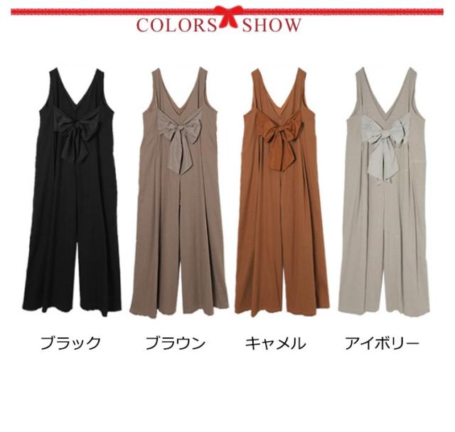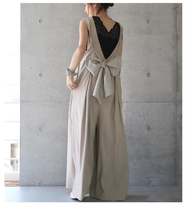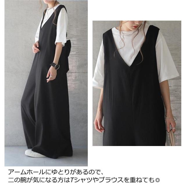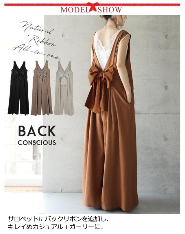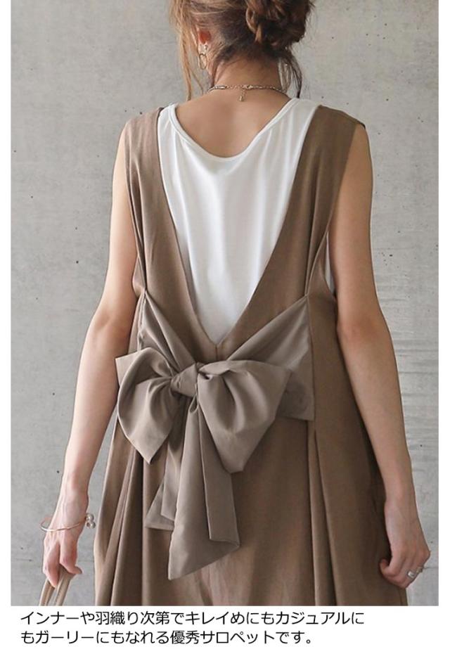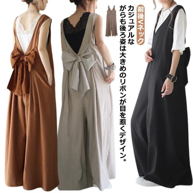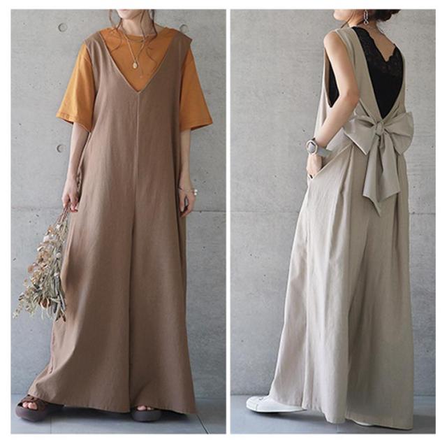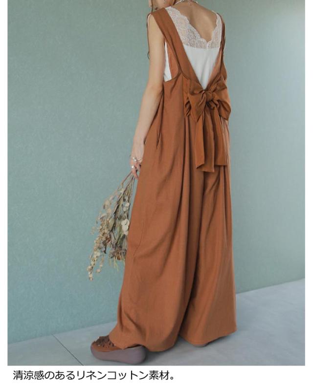 レディース サロペット 綿麻調 春 Vネック オーバーオール ゆったり ワイドパンツ オールインワン サロペット ポケット付き 前後Vネック ビッグリボン オーバーサイズ バックリボン 夏 秋 リネン調 サロペットパンツ パンツ