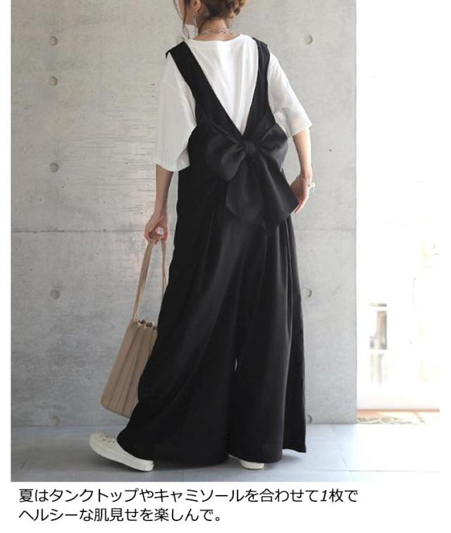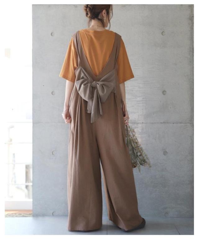 | カジュアルながらも後ろ姿は大きめのリボンが目を惹くデザイン。【前後Vネック】 サロペットにバックリボンを追加し、キレイめカジュアル+ガーリーに。 パンツ部分はワイドなシルエットなので、ゆったりと着られます◎ 両脇にポケット付き。 清涼感のあるリネンコットン素材。 夏はタンクトップやキャミソールを合わせて1枚でヘルシーな肌見せを楽しんで。 アームホールにゆとりがあるので、二の腕が気になる方はTシャツやブラウスを重ねても◎ インナーや羽織り次第でキレイめにもカジュアルにもガーリーにもなれる優秀サロペットです。 | |