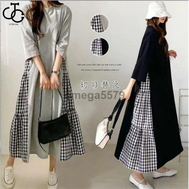 ワンピース レディース 40代 ロングワンピース 春 夏 切り替え チェック柄 お洒落 長袖 ゆったり カジュアル 通勤 着痩せ 大きいサイズ 体型カバー 30代