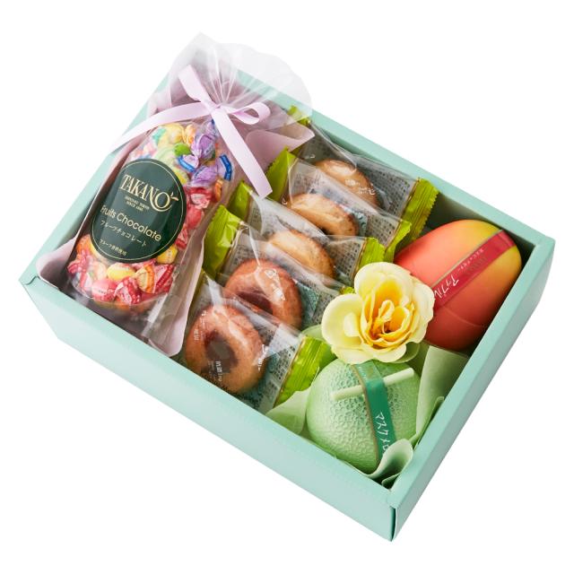| 内容量 | 果実ピュアゼリー(マスクメロン、アップルマンゴー×各1)、果実マドレーヌ(ストロベリー×2、ブルーベリー×3)、フルーツチョコレートSPリボン80g(個包装紙込み)×1、バラ(造花)×1 |