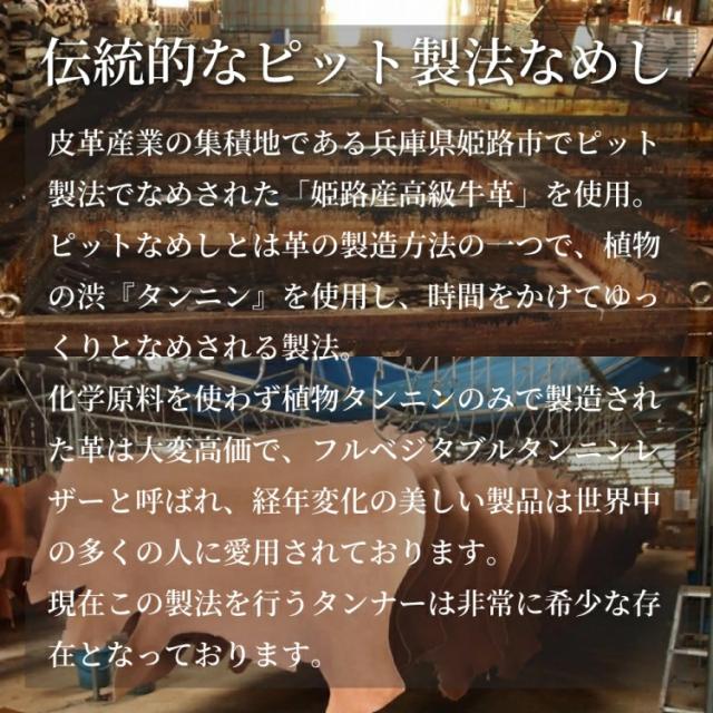 革は姫路産の伝統的なピット製法なめしで仕上げたヌメ革。