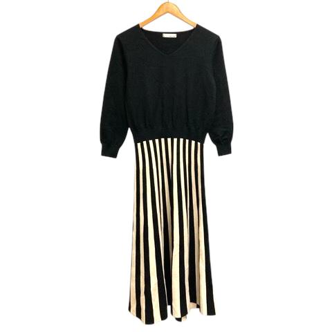 【中古】サイレントワース silent worth ワンピース ニット ストライプ 切替 ロング フレア 長袖 黒 ブラック アイボリー レディース