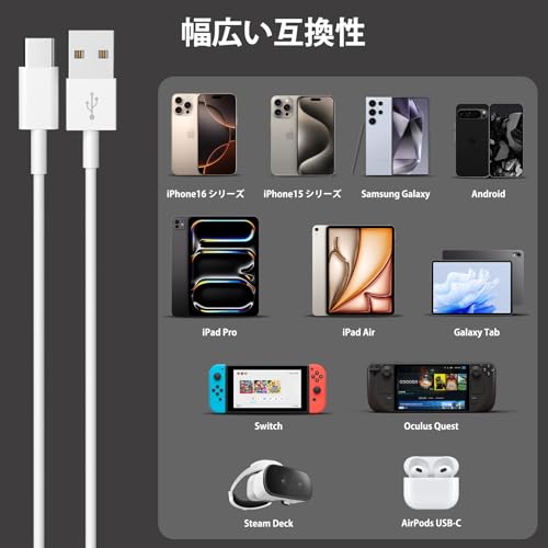 【2本セット USB C-A 充電ケーブル】iPhone 充電ケーブルは最大3Aに急速充電可能です。採用された高品質な銅線は電気抵抗が低く、充電時間を短縮してくれます。また、ケーブルのコネクタは耐熱アルミニウム合金端子を採用しており、導電率が良くデータ損失も最小限に抑えます。TYPE-C 充電ケーブル2セット*1M、いつでもどこでも充電できる便利で快適、自宅、車内、オフィスなど、自由に使えます。あらゆる充電ニーズを解決し、生活の効率化を図ろう!