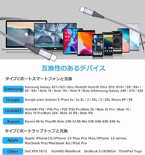 【高品質のUSB C-USB C ケーブル 】:USB-Cポート付きのデバイス(スマホ、タブレット)をUSB-Cポート付きのデバイス(パソコン、チャージャー)に接続するケーブルです。