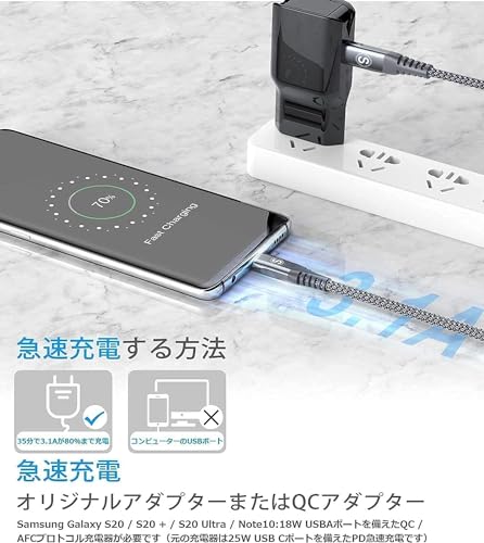 【60W高速充電】:Type C-Type C ケーブルはPD(Power-Delivery)対応により、最大60Wの高出力で安定して充分高速に給電が実現可能です。スマートフォンだけでなく、充電に時間がかかるタブレットやPCなど、充電時間を大幅に短縮できます。PD充電を実現するために、デバイスとアダプタはPD機能をサポートする必要があります。ご使用のデバイスにより供給スピードが異なります。