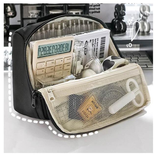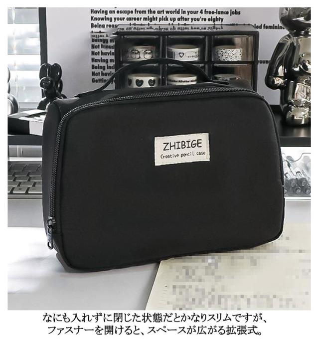 | 消しゴム、付箋、ハサミ、定規、メジャー、修正テープなどの小物もたっぷり収容できます。 ※収容数はペンの種類によって異なります。 メインファスナーがぐるりと大きく開くので、必要なものをスマートに取り出すことができ、ファスナーには引き手がついているので開閉しやすくなっています。 なにも入れずに閉じた状態だとかなりスリムですが、ファスナーを開けると、スペースが広がる拡張式。 ふせんや定規などを分けて収納できるポケットがついています。 筆記具などと分けて収容できるので、小物が探しやすく汚れにくいので安心です。 女性には化粧ポーチとしても有効活用可能。いつも携帯するUSBメモリやスマートフォンの携帯充電器の機器類にも。 常備薬や目薬、塗り薬などちょっとした小物入れにも。多様に利用できて用途は広がります。 | |