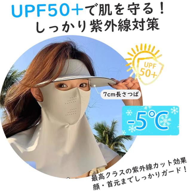 UPF50+で紫外線を99%以上カットし、首元までしっかり守るロングフェイスカバー。