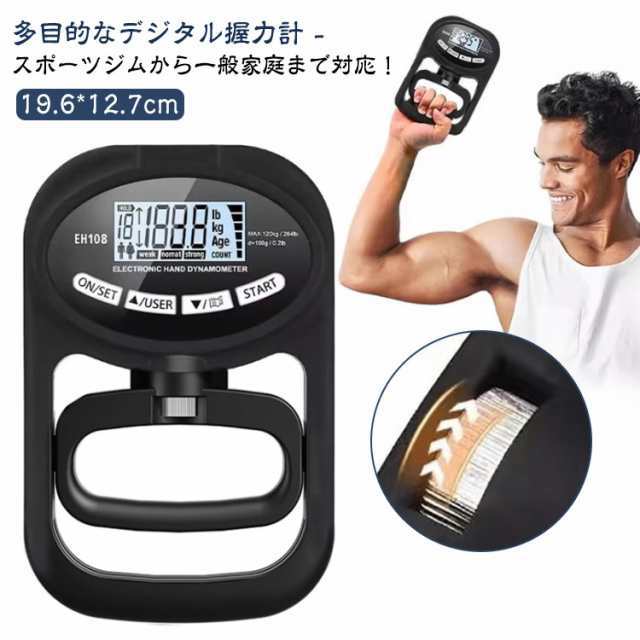 商品説明 多目的なデジタル握力計 - スポーツジムから一般家庭まで対応!高精度デジタル握力計は、最大120kgまでの握力を精密に測定します。軽量設計で、携帯にも便利です。簡単な操作で常に最高のパフォーマンスをサポートします。この製品は、業界初のデュアル電源システムを採用しています。内蔵リチウム電池によりUSBで充電可能で、さらに乾電池も使用可能です。これにより、場所を選ばずに信頼性の高い測定が可能です。シンプル測定モードでは迅速にチェックができ、ユーザー測定モードでは詳細なデータ記録が可能です。この2つのモードで、自分の握力を意識的に管理し、向上させることができます。最大19パターンのユーザー情報を登録可能で、平均値の比較機能も備えています。グリップ部分は手の大きさに応じて調整可能なので、使いやすさは抜群です。スポーツジム、介護施設、学校、法人、団体など多くの場面で導入されており、もちろん一般家庭でも広く利用されています。 サイズ電池タイプ USB充電タイプサイズについての説明サイズ:19.6*12.7cm