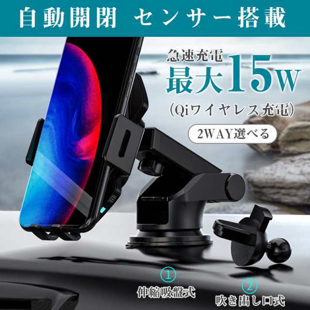 スマホホルダー 車 車載 ワイヤレス 充電器 自動開閉式 スマホ iphone QI 置くだけ充電 スタンド 15W 吸盤 車用 ワンタッチ 360度