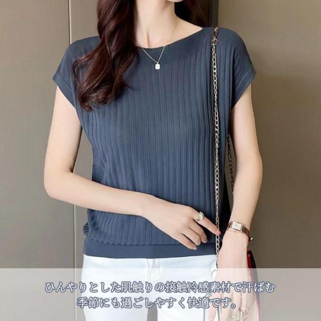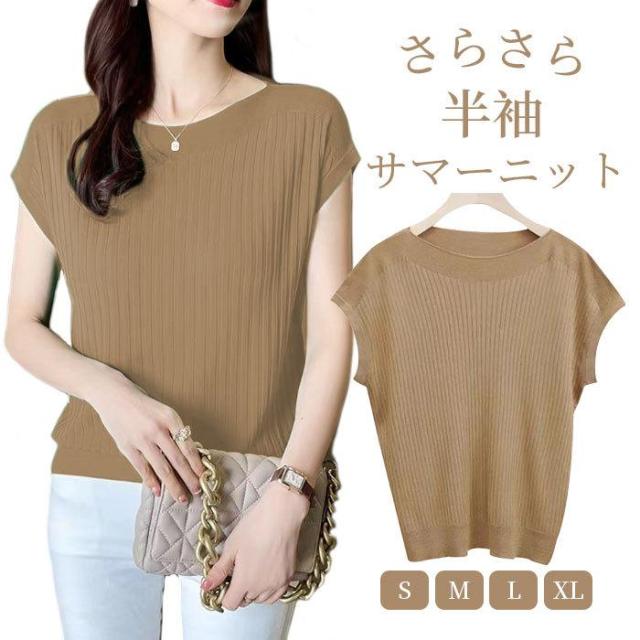商品情報程よく女性らしさを感じさせるクルーネックサマーニット肩先までかかるフレンチスリーブのため、気になる二の腕周りもさり気なくカバー縦のリブ編みで細見えもかなえる。さらっとした着心地で、汗ばむ時期もOKカーディガンと合わせたたり、春、夏、秋と長いシーズンで活躍すること間違いなしの1枚です。カラー:ホワイト/ブラック/グレー/ベージュ/ネイビー/グリーン/ブラウンサイズ:S/M/L/XL/2XL素 材:ビスコース ナイロン裏地:なし【ご注意】※サイズ表記は目安となり誤差が生じる場合もございます。※生産関係上、お使いの機器等により色や柄等、若干異なる場合がございます。※素材特有の臭いや接着剤等の臭い、縫製上の細かいほつれ、汚れ等が残っている場合がございますので、気になるお客様はご購入をお控え下さい。tシャツ レディース 半袖 サマーニット フレンチスリーブ トップス ブラウス 半袖シャツ ノースリーブシャツ 30代 40代 50代 60代 夏 春シャツ 秋 おしゃれ きれいめ オフィス 通勤 通学 ビジネスシャツ インナー