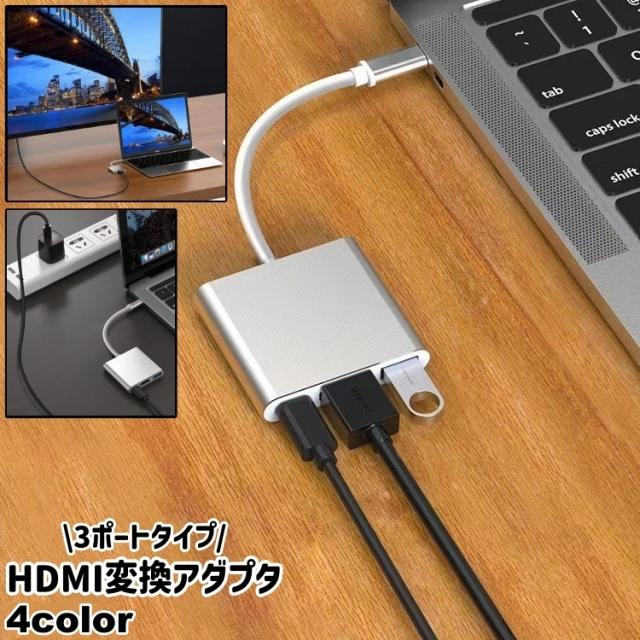 HDMI変換アダプタ 変換コネクタ タイプC Type-C PD USB3.0 3ポート 3in1 シンプル パソコン ノートパ