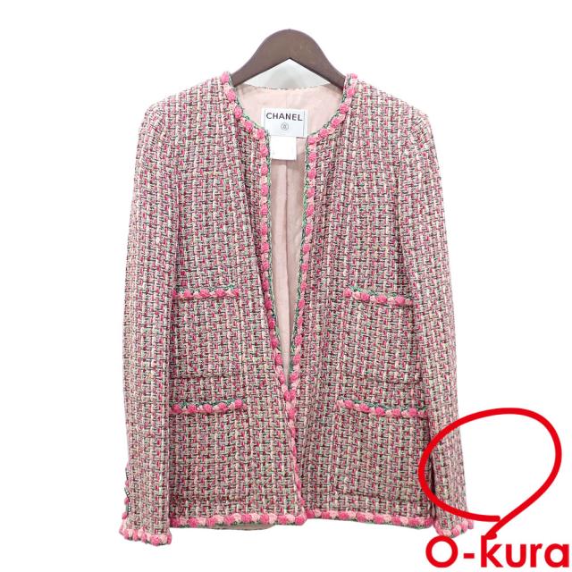 中古 シャネル ノーカラー ツイードジャケット レディース 長袖 ロング丈 レーヨン コットン他 ピンク系マルチカラー サイズ36 P19117V11040 ココボタン ラインストーン フラワー 花 古着 アパレル アウター