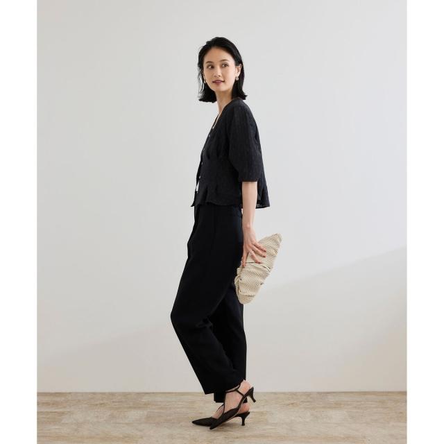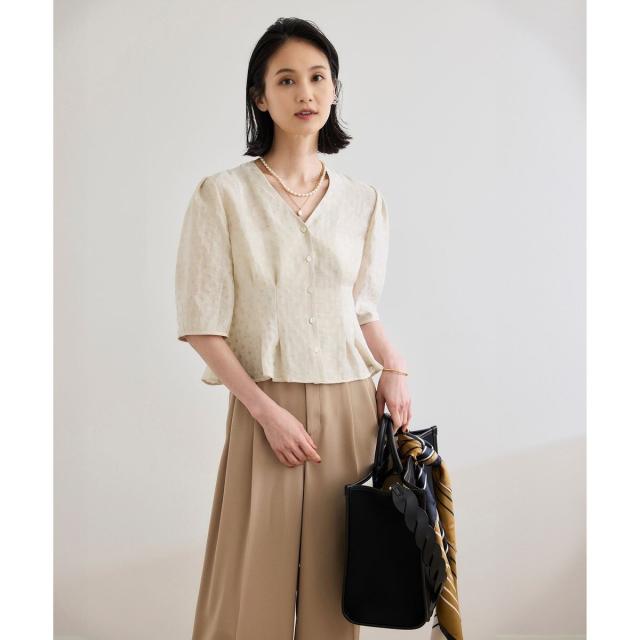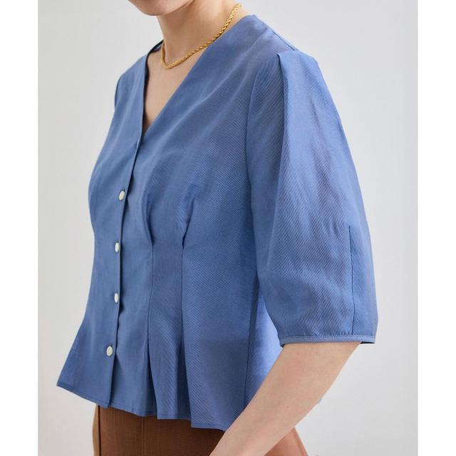 袖にボリュームをもたせ、ウエストシェイプしてペプラムになったシルエットがフェミニンな印象のデザインブラウスです。Vネック開きで顔周りをすっきり見せ、小顔効果も期待できます
