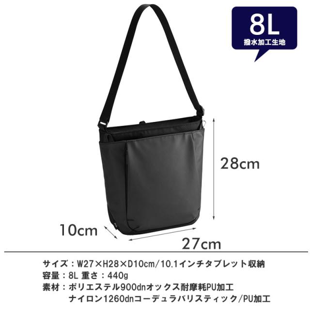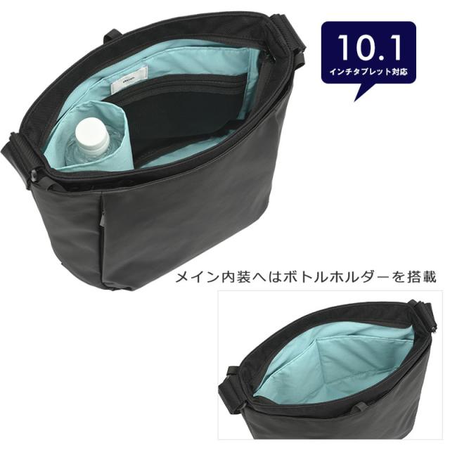 撥水加工を施した丈夫な生地で、雨の日も安心。メイン収納には10.1インチタブレットが入り、小物に便利な外ポケットも装備。