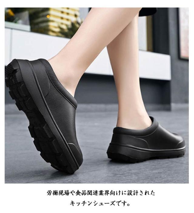 | 労働現場や食品関連業界向けに設計されたキッチンシューズです。 【防水・防油】シューズ全体に防水・防油に特化した素材を使用しているので、 汚れや油がついても、さっと拭きとれば落ちやすいためお手入れも簡単。 【滑り止め】こちらはグリップ力の高いソールの為、 水や油、洗剤等で滑りやすい床面に適しています。安心して作業に集中ができ、パフォーマンス効率もアップ! 【柔らかいインソールで疲れない】クッション性の高いインソールを使用しているので通気性もよく快適。 【快適な履き心地】足先が広めの丸みのある形状で、指先ゆったりリラックス。食材や器具を落としてしまっても安心で、急いでいてもさっと履ける仕様になっています。 【男女兼用で様々なシーンで使える】ソール部分も高さがあり浸水しにくく、厨房以外でも、雨の日のちょっとそこまで等のお出かけやデイリーユースにも、ガーデニングや農作業、 お風呂掃除、海辺のレジャーや軽めのアウトドアなどあらゆるシーンでお使いいただけます。 | |