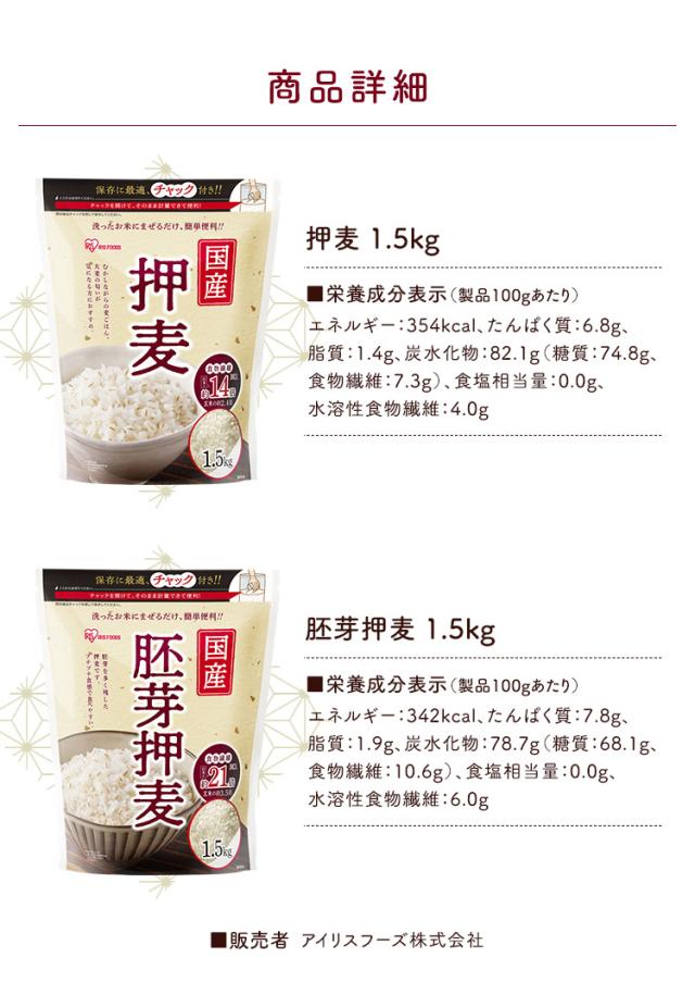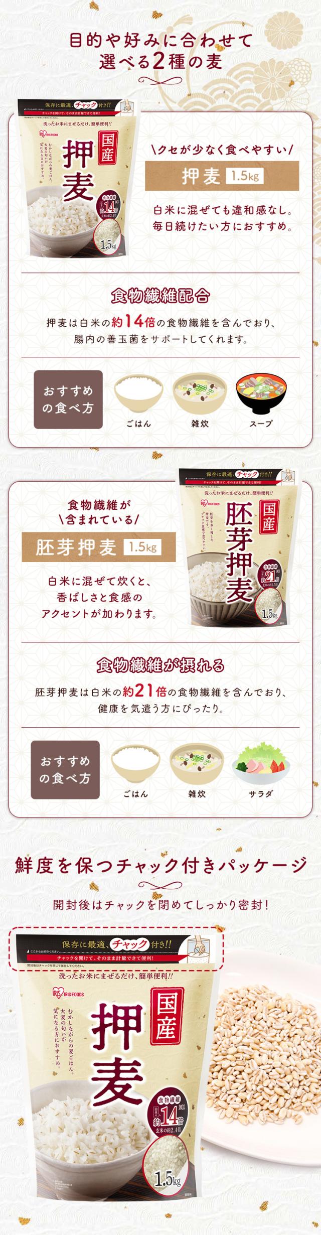 (検索用:押し麦・1.5kg・押麦・胚芽押麦・胚芽押し麦・食物繊維・麦飯・麦ごはん・麦とろごはん・洗ったお米・混ぜるだけ・簡単・栄養バランス・かさ増し・米不足・大麦・雑穀・穀類・チャック付き袋・押麦・胚芽押麦・4562403786203・4562403786197・アイリスオーヤマ)