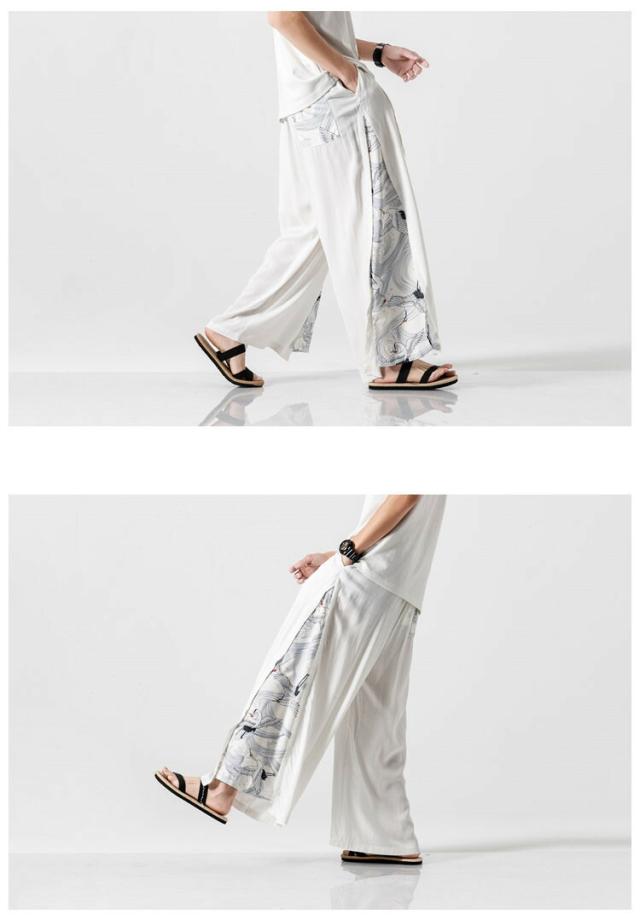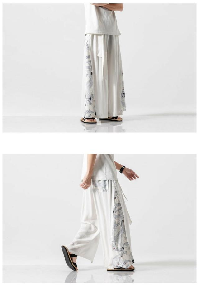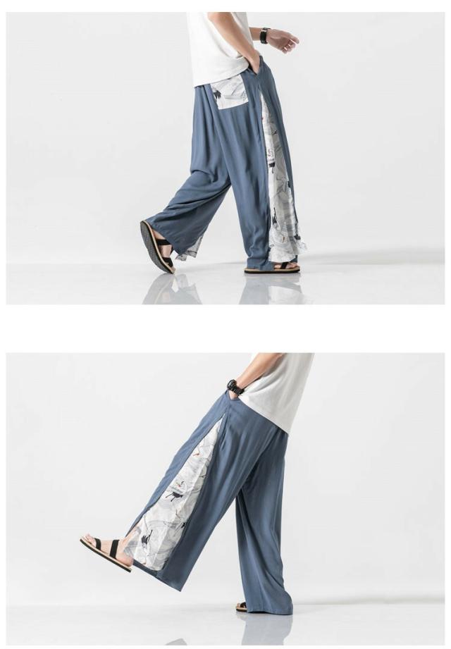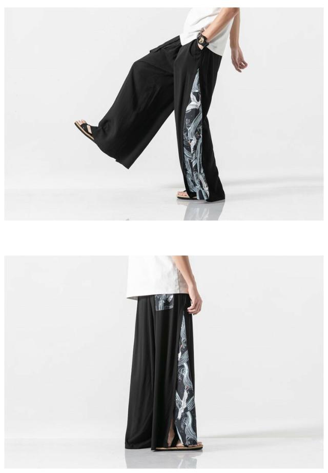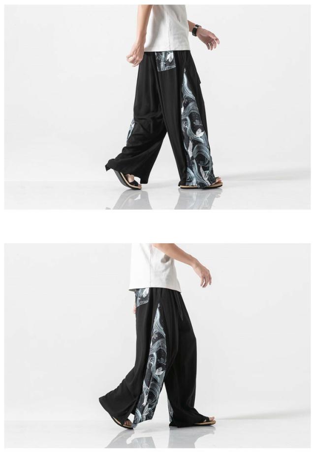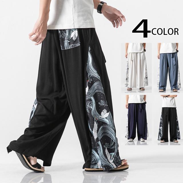 サルエルパンツ ワイドパンツ イージーパンツ メンズ 袴パンツ 麻 リネンパンツ 鶴柄 涼しいパンツ シューカットパンツ メンズ パンツ ズボン ボトムス ゆったり 大きいサイズ 大きめ ビッグ 春 春服 夏 夏服 和風