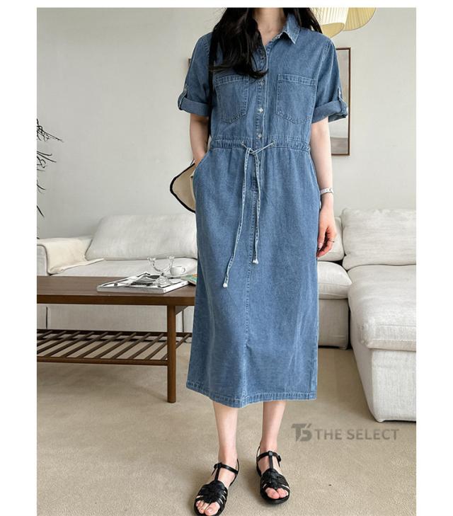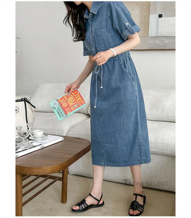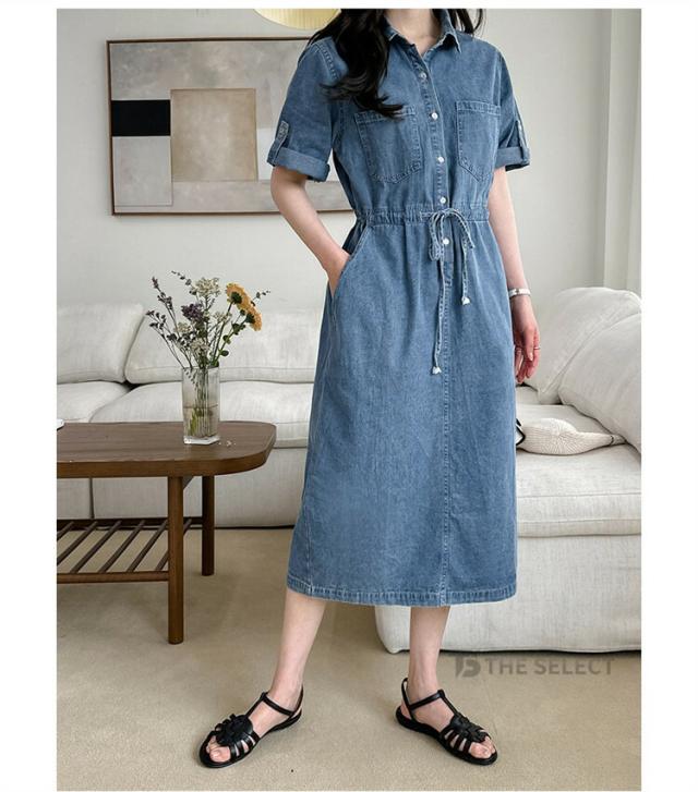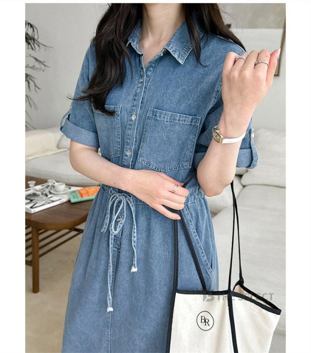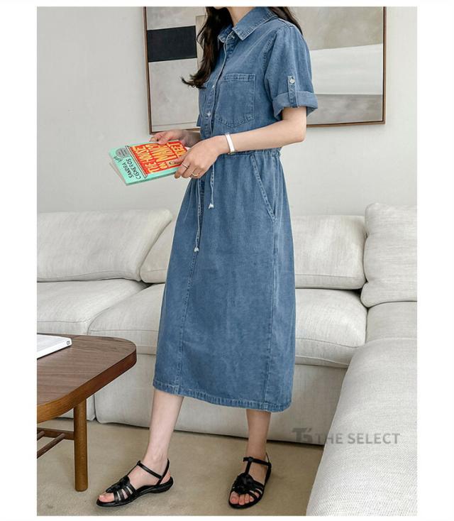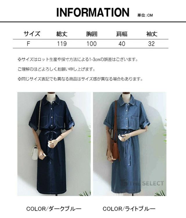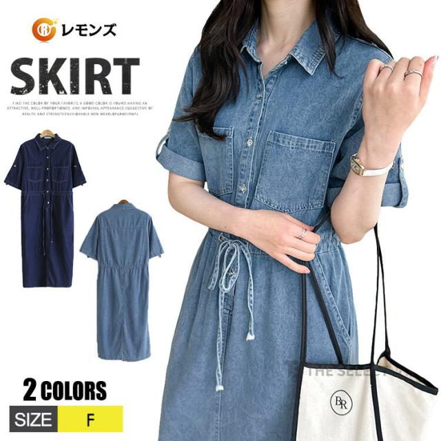 デニムワンピ ワンピース レディース ワンピ ロングワンピース ロング 半袖 ゆったり 夏 デニム ロールアップ ウエストリボン 胸ポケット ウエストゴム デニムワンピース 送料無料