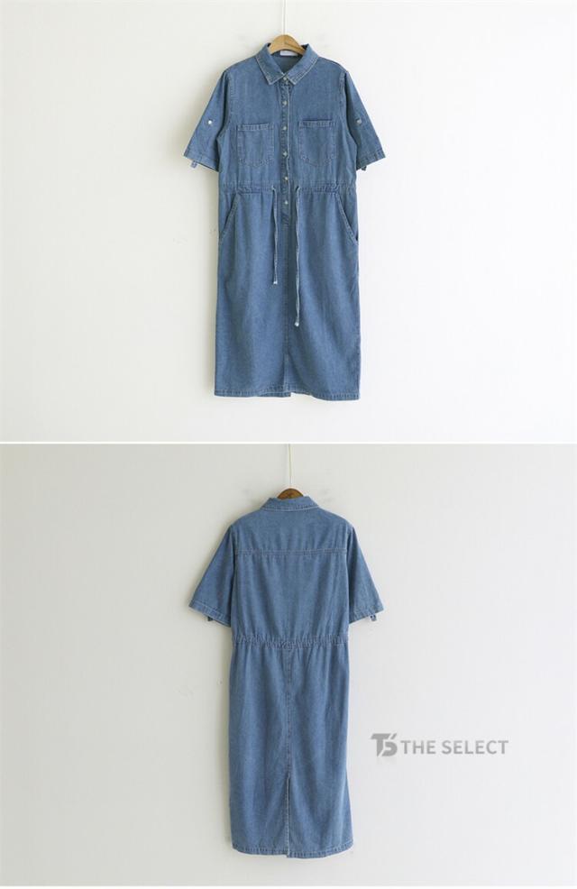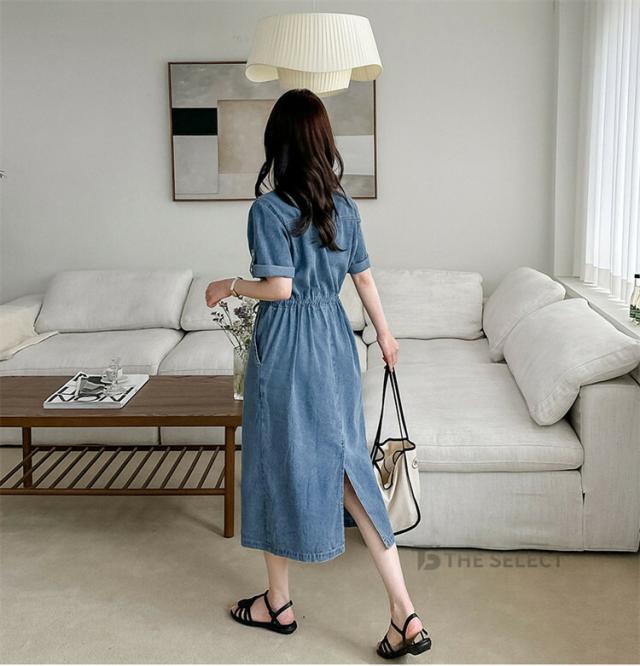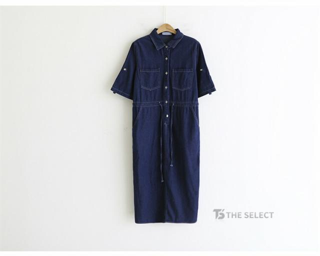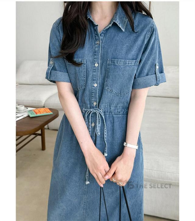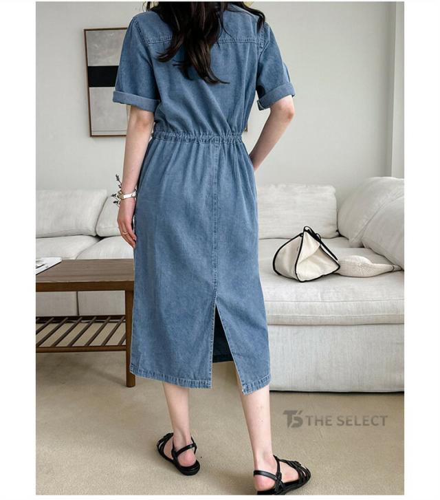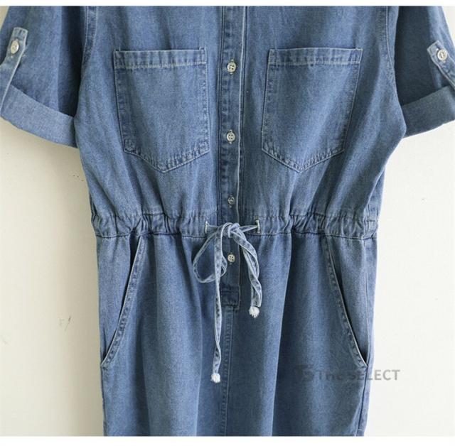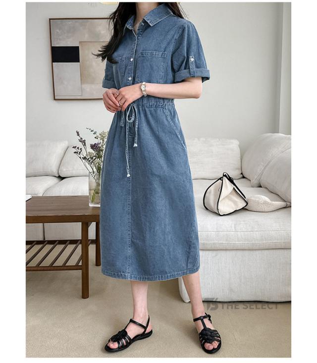 デニムワンピ ワンピース レディース ワンピ ロングワンピース ロング 半袖 ゆったり 夏 デニム ロールアップ ウエストリボン 胸ポケット ウエストゴム デニムワンピース 送料無料
