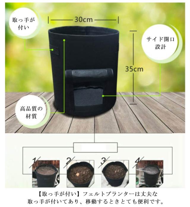 | 【高品質の材質】環境に優しい不織布。厚手の不織布と裏地から作られて、通気性、透水性、放熱性に優れているため植物の発育が良いと評価され、育苗、植栽用の鉢として広く使われています。高温時は熱で根が傷むこともありませんが、根の発育を促進し、根腐れが起こりにくいです。また丈夫さがよくて長持ちができ、何回を繰り返して利用できます。 【サイド開口設計】可視ウィンドウから簡単に収穫できます。これを使用して、野菜が熟しているかどうかを判断し、粘土土を掘ったり、苗を傷つけたりすることなく、直接収穫できます。 【室内栽培可能】軽量で持ち手が付いてるので移動が楽です。室内栽培可能,透水性と保水性がありますので底面に石を敷く必要なし。不織布が土の流出を防ぎ鉢底石いらずのポットなので、ベランダでの利用にも便利です。 【取っ手が付い】フェルトプランターは丈夫な取っ手が付いてあり、移動するときとても便利です。 【広範囲な用途】ジャガイモ、タロイモ、大根、ニンジン、タマネギ、ピーナッツ、その他多くの野菜を植えるのに最適です。また、トマトやキュウリなどの野菜も栽培できます。お花を育てたり、野菜を育てたり、ガーデニングにも最適な不織布ポットので、お庭の野菜つくりやベランダ菜園・ハーブ類を育てるときにを楽しめます。 | |