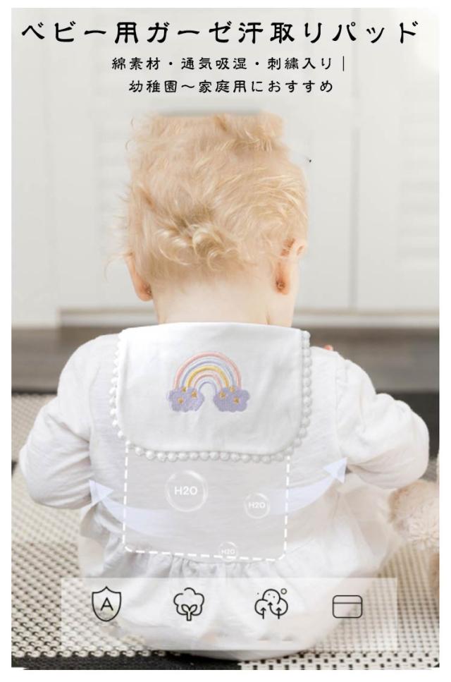 | ベビー用ガーゼ汗取りパッド 綿素材・通気吸湿・刺繍入り|幼稚園〜家庭用におすすめ ガーゼ生地|汗をしっかり吸収 吸汗&速乾、洗うほどに柔らかくなる優しい質感 肌に直接触れる部分は通気性&吸湿性抜群 汗を素早く吸収し、背中をさらっと快適にキープ お着替え回数を減らしてママも安心 刺繍入りデザイン+丁寧な縁取り 可愛い刺繍で見た目もおしゃれ 加幅ロック加工で型崩れ&ほつれ防止 汗をよくかく季節や、活発に動くお子さまにぴったり。幼稚園のお昼寝タイムやお出かけにも便利です。 | |