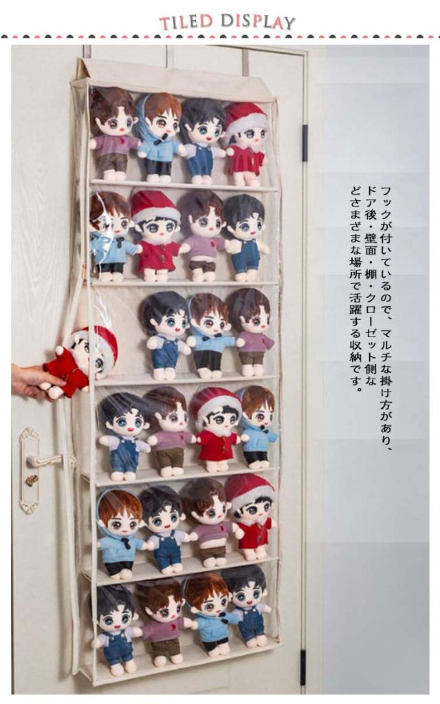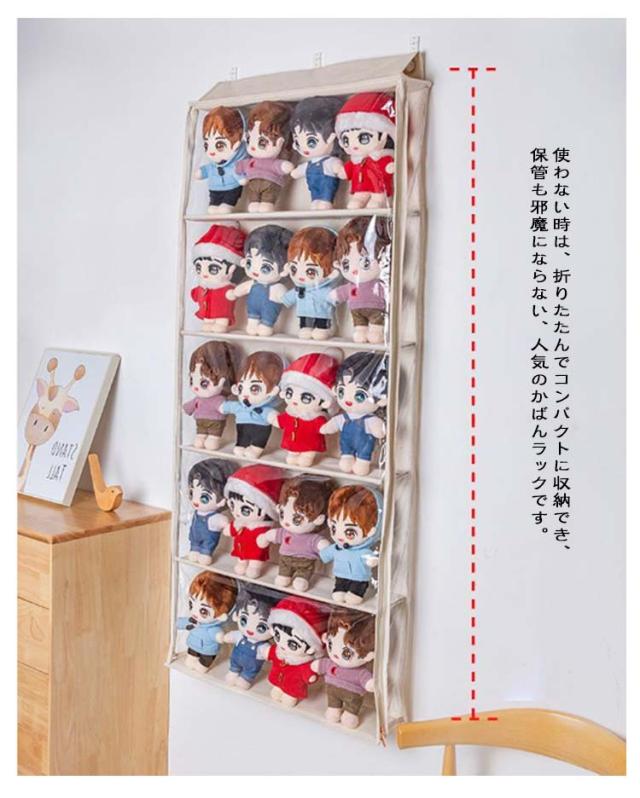 | 【ぬいぐるみ収納】【5段/6段ウォールポケット】【使用場所自由自在】 スタイリッシュデザインのディスプレイラックです。 透明度の高いビニールになっていて、中に入れたものをディスプレイしながら壁面に収納できるアイテム。 左右から開閉可能な両開きファスナー、お手入れと取出しがより便利、入れ替えなども楽々! 密閉設計で湿気やホコリを遮断し、大切なコレクションを守ります。 フックが付いているので、マルチな掛け方があり、ドア後・壁面・棚・クローゼット側などさまざまな場所で活躍する収納です。 使わない時は、折りたたんでコンパクトに収納でき、保管も邪魔にならない、人気のかばんラックです。 | |