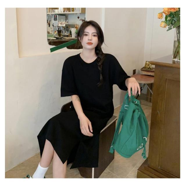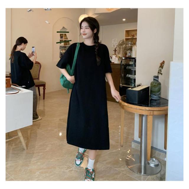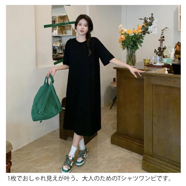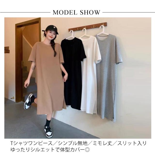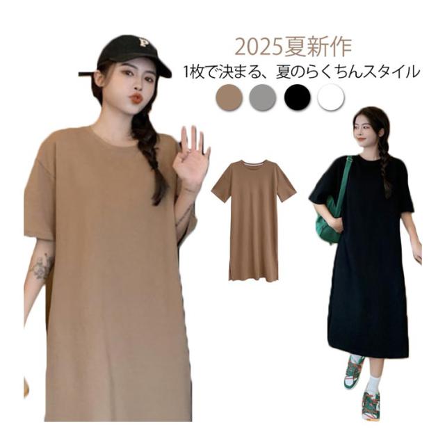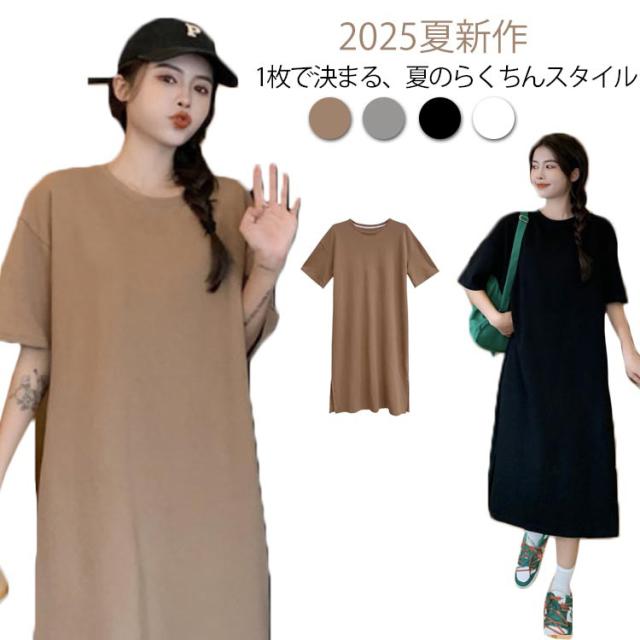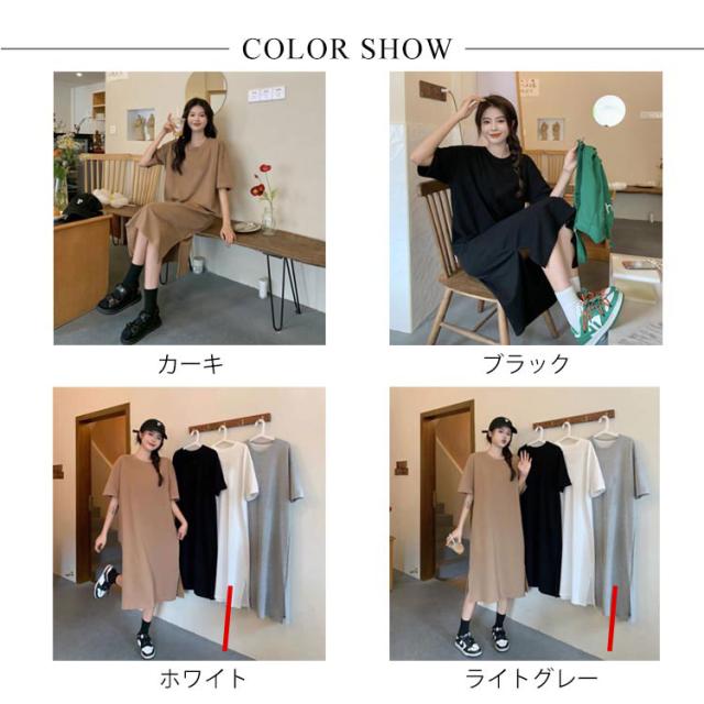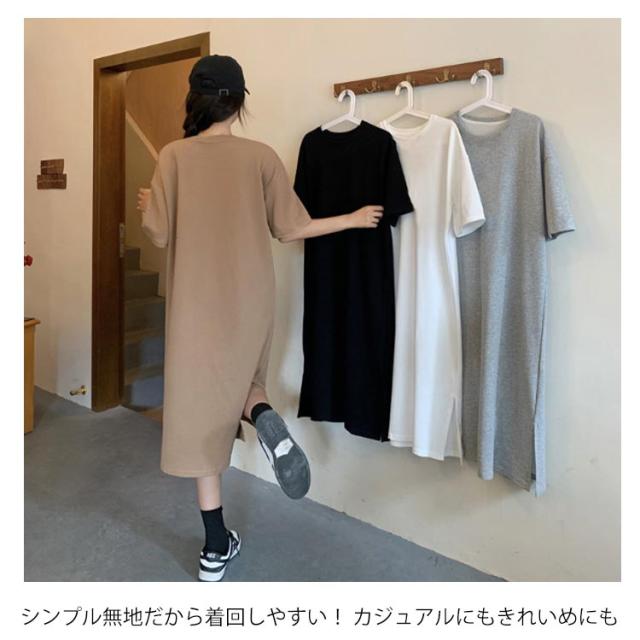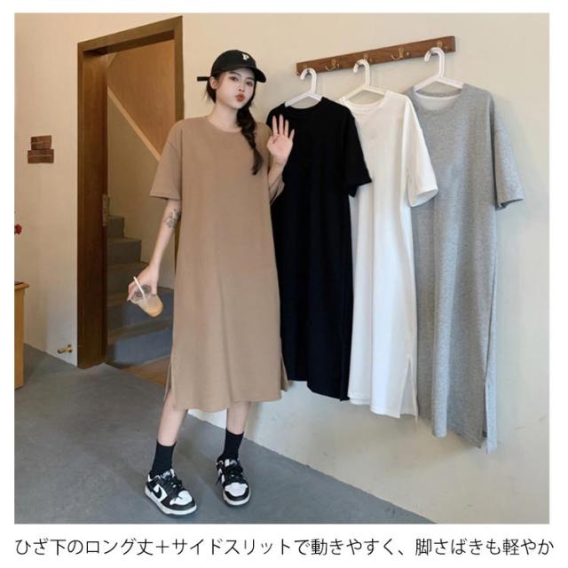 カットソー 半袖 夏 ロング丈 レディース 春 ワンピース サイドスリット 無地 シンプル ゆったり tシャツワンピース クルーネック Tシャツワンピ チュニック ルームウェア カジュアル