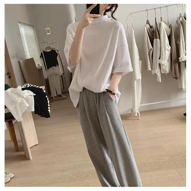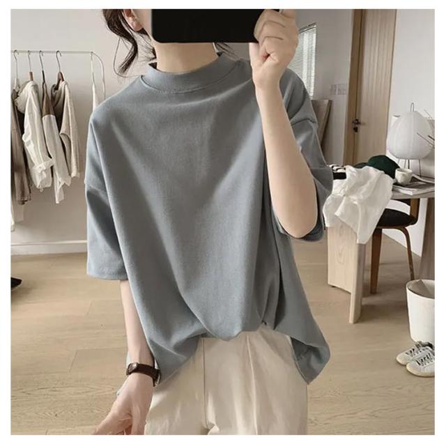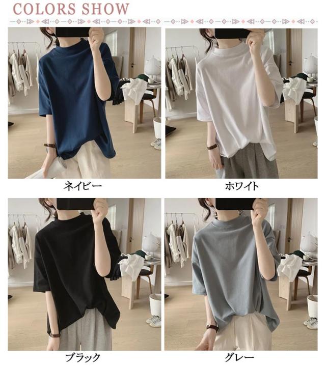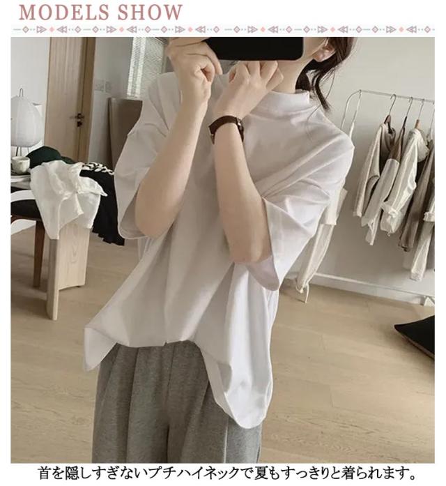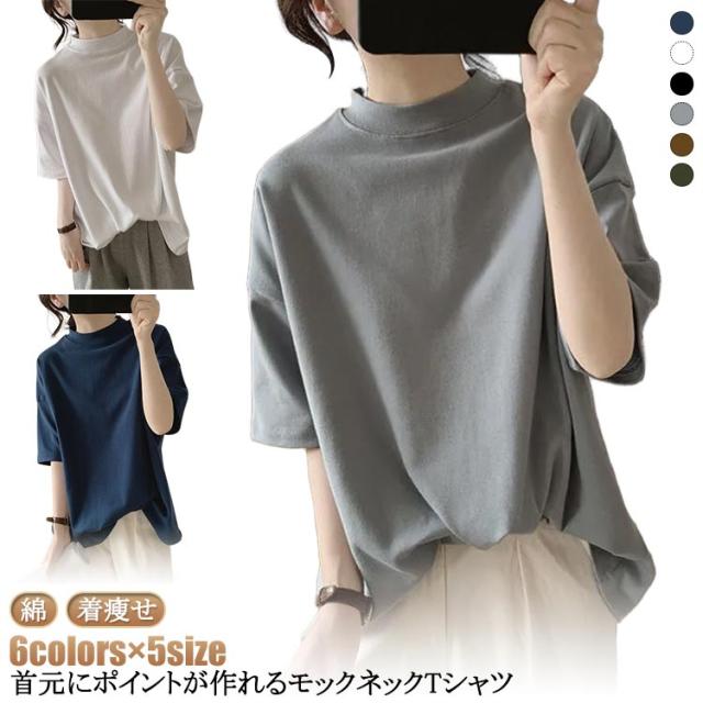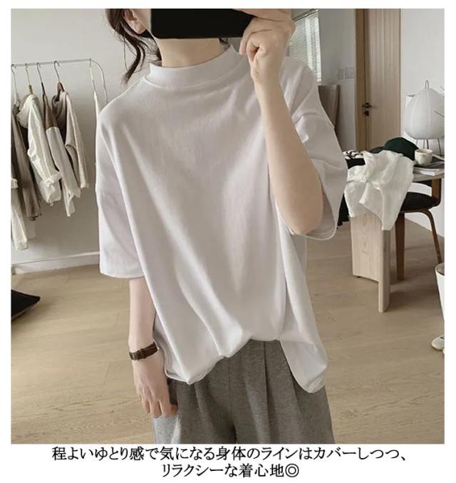 カットソー Tシャツ モックネック ドロップショルダー ハイネック 半袖 綿 tシャツ 夏 トップス 女性 レディース 着?せ ハイネック ゆったり 5分袖 プチハイネック 大きいサイズ 無地 シンプル 通勤 薄手 大人