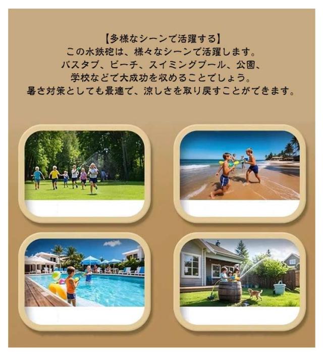 | 花火のようなデザインが特徴の「花火 水鉄砲 ウォーターガン」は、夏の水遊びを一層楽しくします。 【花火のような水鉄砲】この水鉄砲は、超強力な性能を備えており、水を花火のように勢いよく撃ち出します。夏の定番の水遊びに最適なおもちゃで、水ピストルとしての威力は子供から大人まで楽しめます。 【耐久性に優れた】高品質の素材を使用して作られており、耐久性に優れています。水にさらされることが多い水遊び用のおもちゃですが、長期間にわたって繰り返し使用しても、破損や劣化することがありません。 【使い勝手抜群】大きさで、持ちやすく使い勝手が抜群です。先を水の中に入れ、レバーを引いて水を得てから、レバーを押して水を噴霧します。 子供も大人も手に馴染みやすく、快適に水遊びを楽しむことができます。 【親子で楽しめる】この水鉄砲は軽量でコンパクトで、触り心地が良いので、お子様が握りやすくなっています。 プールとビーチに行って、すぐに暑さを吹き飛ばしましょう!親子ゲームとしても最適なこの水鉄砲は、家族みんなで一緒に楽しめるストリームマシンです。暑い今年の夏の外遊びにぴったり! 【多様なシーンで活躍する】この水鉄砲は、様々なシーンで活躍します。バスタブ、ビーチ、スイミングプール、公園、学校などで大成功を収めることでしょう。暑さ対策としても最適で、涼しさを取り戻すことができます。 | |